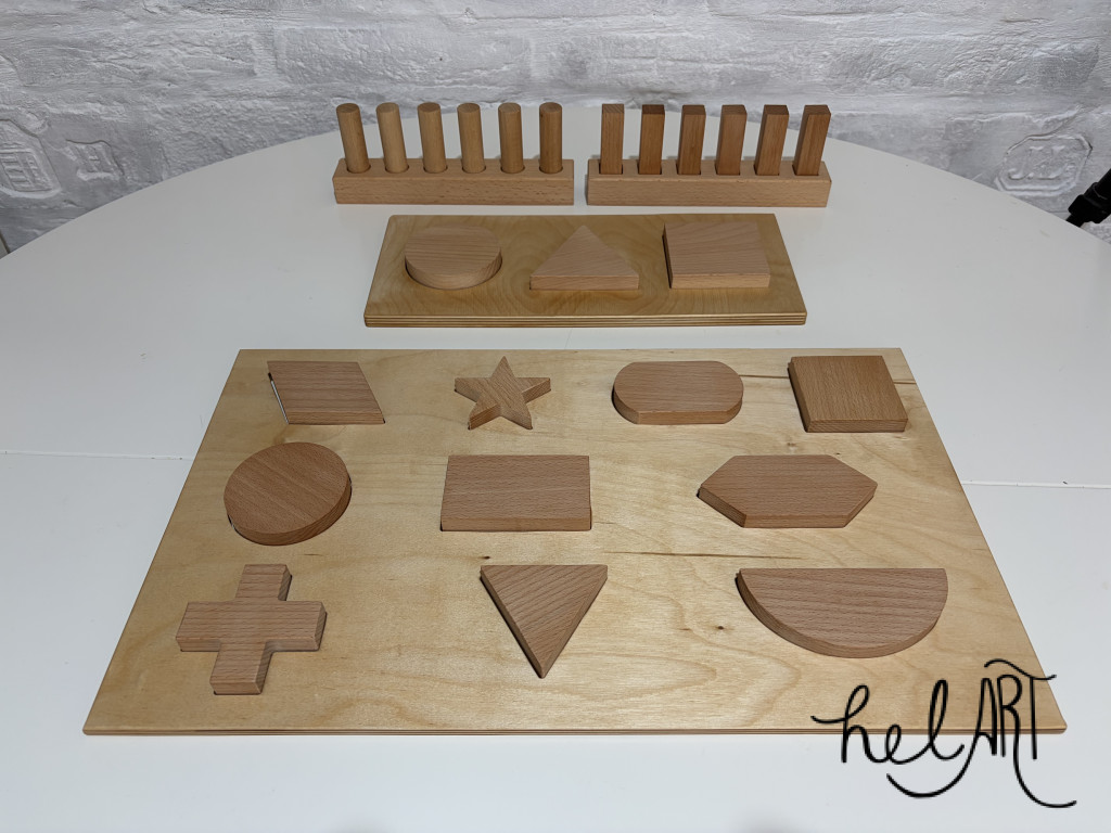 Tools and shapes made of hardwood, with their help, the little ones can learn to count, write, match shapes and colors.